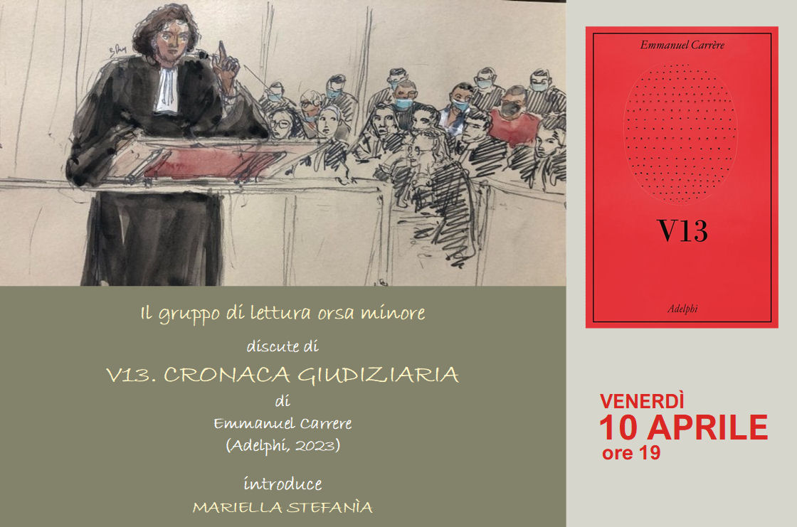 10 aprile 2026 Gruppo di lettura Orsa Minore. Appuntamento in libreria alle ore 19 con V13 di Emmanuel Carrère (Adelphi). Apre la discussione Mariella Stefania. locandina | foto | 9 aprile 2026 Associazione culturale Enrico Berlinguer. Luca Telese presenta Opposizione. L’ultima battaglia di Enrico Berlinguer (Solferino). Foyer del Teatro Comunale, ore 19. locandina | foto | 10 marzo 2026 Pier Paolo Becich di San Servolo presenta Il leone alato. Una storia di oggi sulle ali del passato (De Bastiani editore, 2025). (in libreria, ore 19). locandina | foto | 7 marzo 2026 Luca Maria Pernice presenta Parlatene! Mafia e antimafia in Capitanata (La Meridiana, 2025). Interviene Amelia Viglione (Palazzina Liberty, ore 18,30).