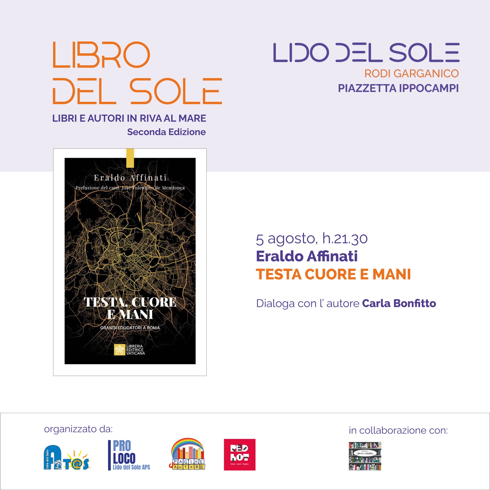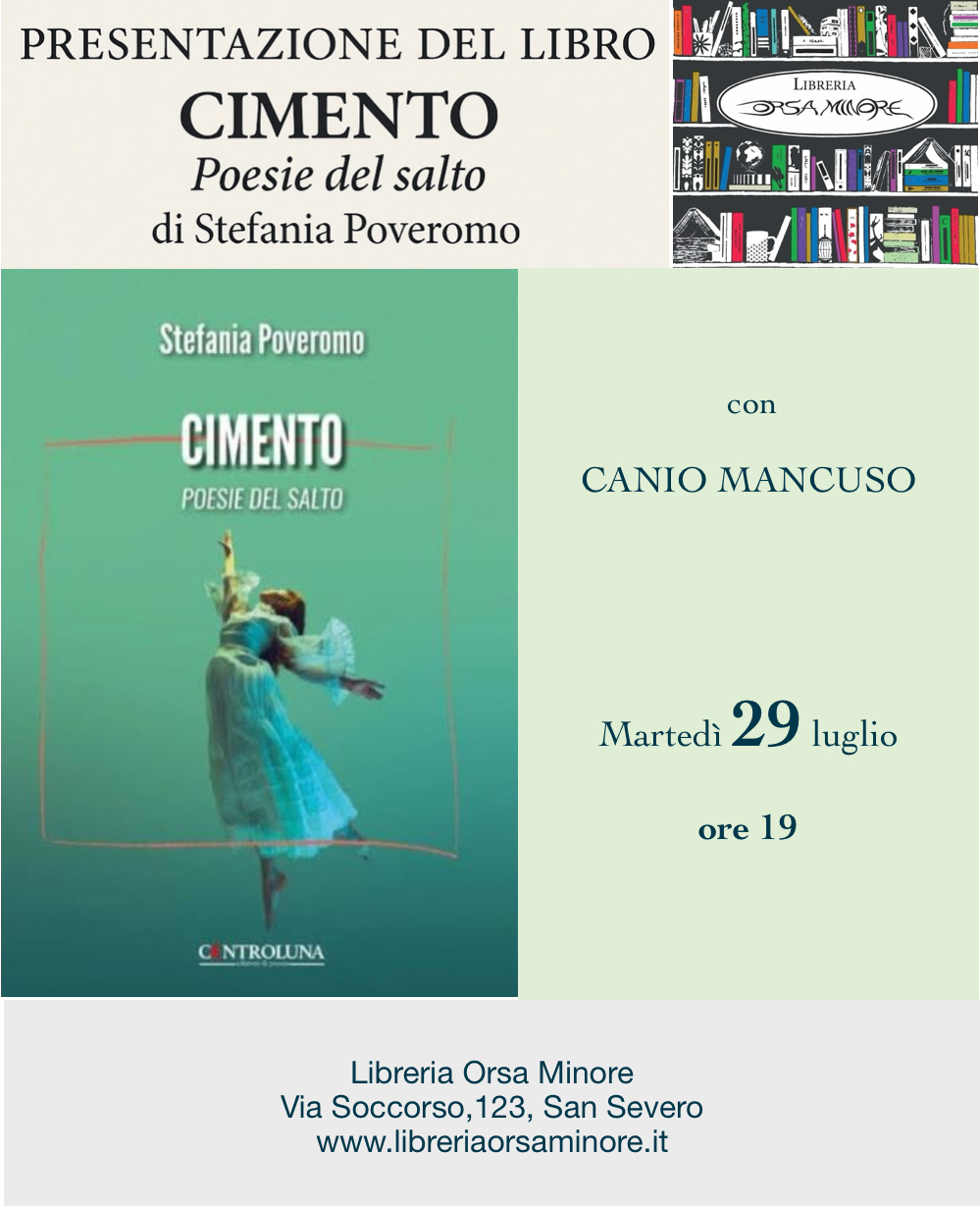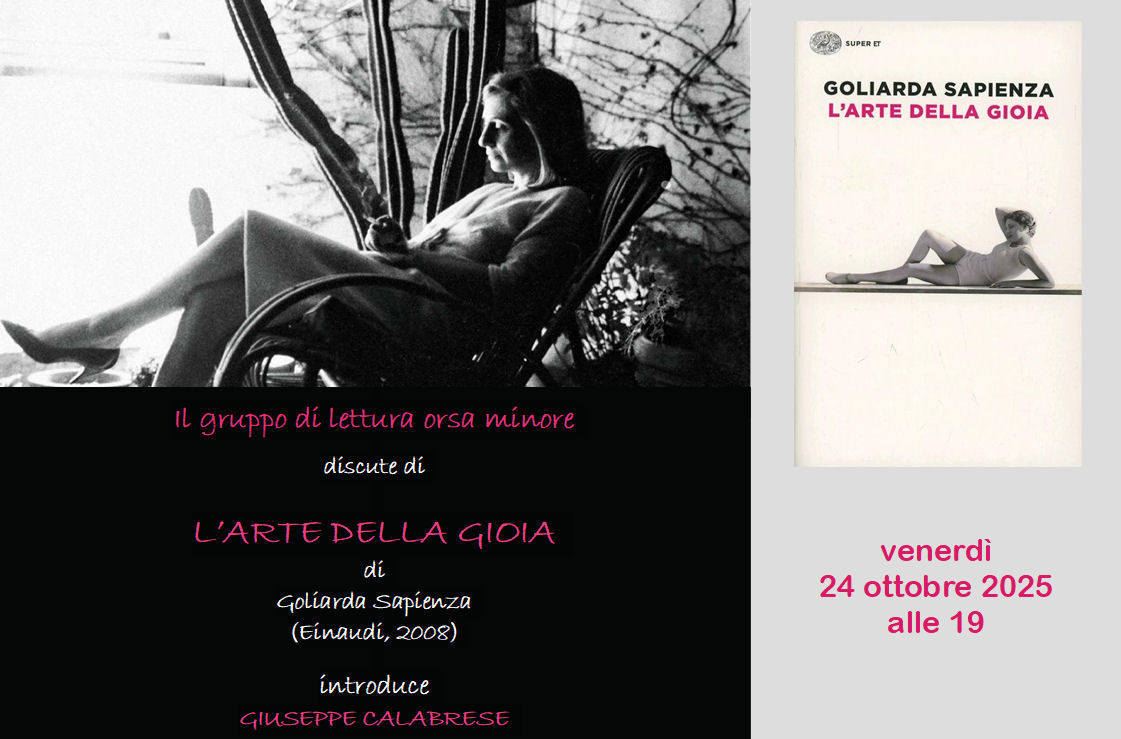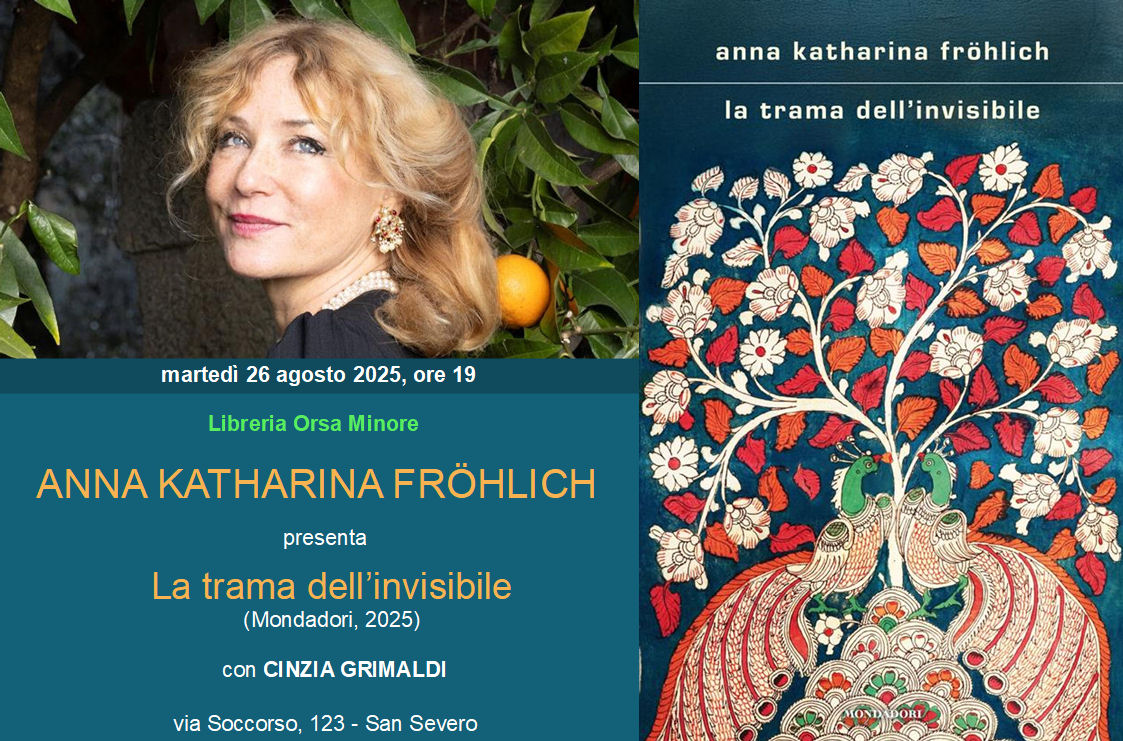 24 ottobre 2025 Gruppo di lettura Orsa Minore. Appuntamento in libreria alle ore 19 con L’arte della gioia di Goliarda Sapienza (Einaudi, 2008). Apre la discussione Giuseppe Calabrese. locandina | 26 agosto 2025 Anna Katharina Fröhlich presenta La trama dell’invisibile. Con Cinzia Grimaldi.(in libreria, ore 19). locandina | foto | 5 agosto 2025 Libro del Sole, Eraldo Affinati presenta Testa, cuore, mani. Dialoga con l’autore Carla Bonfitto. (piazzetta degli Ippocampi, ore 21,30). locandina | foto | 30 luglio 2025 Libro del Sole, Gabriella Genisi presenta Una questione di soldi. Dialoga con l’autrice Carla Bonfitto. (piazzetta degli Ippocampi, ore 21,30) locandina | foto | 29 luglio 2025 Stefania Poveromo presenta Cimento. Poesie del salto. Con Canio Mancuso. (In libreria, ore 19). locandina | foto |